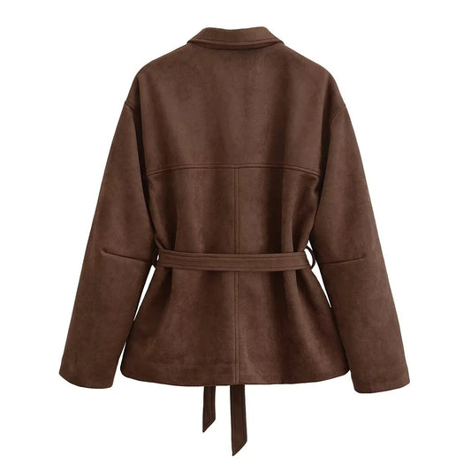 Loose Casual Polo Collar Long Sleeve With Belt Suede Shirt Jacket